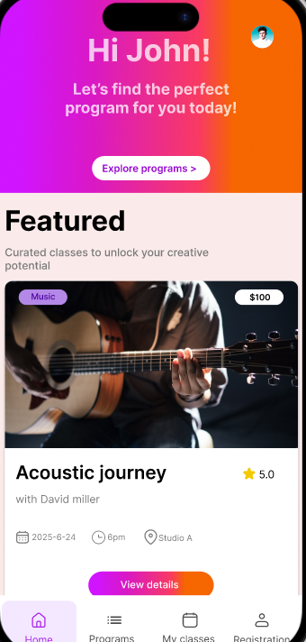 Figma • 3rd December 2025 SparkStudio An interactive prototype of an app for an enrichment centre which offers music, art and dance programs I did on Figma